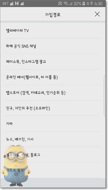 저 땐 처음 깔아서 쓸 때라 1일이군요. 그럼 본인이 여성인지 남성인지 체크하시고 어떤 가입경로로 화해를 알게 됐는지 일종의 사전 리서치를 하는 것 같습니다. 전 앱스토어를 통해 알았기 때문에 앱스토어 꾹~혹 이 포스팅을 보시고 어플 까시는 분들이라면 커뮤니티/카페/블로그를 선택하시면 되겠군요. ^^