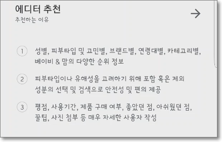 어플을 설치하고 에디터 추천이라는 항목을 발견하고 읽어봤습니다. 왜 추천하는지에 대한 이유인듯 한데 자세히 보니 내가 필요로 하는 정보가 거의 포함되어 있었습니다. 성별 또는 피부 타입 및 각자의 고민별, 연령별, 브랜드별, 카테고리 별등 등 한 개의 화장품을 사더라도 이런 관련 정보를 모두 살펴보고 구매하고 싶었거든요. 특히나 내 피부 타입에 맞는 것을 고른다는 것이 중요한데 과연 제대로 추천해 줄까 의구심도 살짝 들지만 관련 정보들을 한번 봐야겠지요.