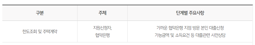 한도조회 / 주택계약 후 신청서를 접수 하시고 대상자에 선정되시면 신청 후 입금을 받는 과정을 거치시면 됩니다. 더 자세한 사항을 표를 참고해서 살펴보시면 더 확실하게 아실 수 있겠네요.