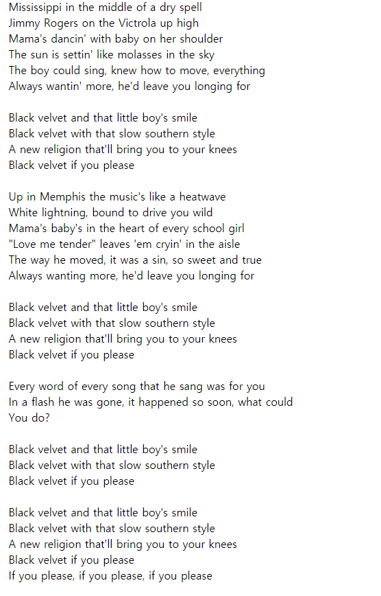 "앨레나 마일즈(Alannah Myles)" 의 "블랙 벨렛(Black Velet)" 입니다. 우리나라 대중에겐 그다지 알려지지 않았던 싱어송라이터 그녀는 캐나다 출신으로 1990년에 열렸던 그래미 여성 락 보컬상을 받았을 만큼 여러 국가에서 음악성을 인정 받은 여성락커 입니다. Black Velet은 락컨롤의 제왕이라 불리는 엘비스 프레슬리를 추모한 곡으로도 유명한데요. 잘 모르셨던 분들이라면 이 기회에 한번 들어보시죠~롹켄롤 베이비~~~