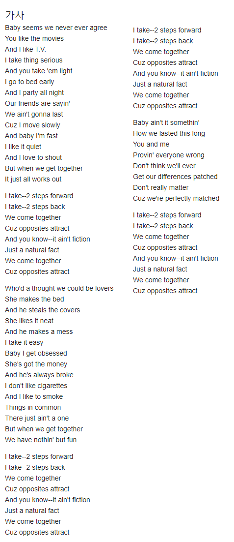 "폴라 압둘(Paula Abdul)"의 "옵사이트 어트렉트(Opposites Attract)" 입니다. 마이클 잭슨의 동생 자넷 잭슨의 안무가로 활동한 이력이 있는데요. 데뷔년도는 1988년으로 처음 데뷔하고 발매한 앨범에서 무려 1위를 4곡이나 하는 저력을 보였죠. 한때는 자넷잭슨 이나 마돈나등과도 견줄 수 있다는 평을 받았던 여성 뮤지션. 한때는 LA 레이커스에서 치어리더 활동도 했다고 하더군요. 최근에는 아메리칸 아이돌에서 오랜기간 심사위원도 하던데 세월의 흐름은 막을 수 없다군요. 자 그럼 옛 디바의 추억을 되살려 볼까~~~요. 뮤우직~스따트~~~