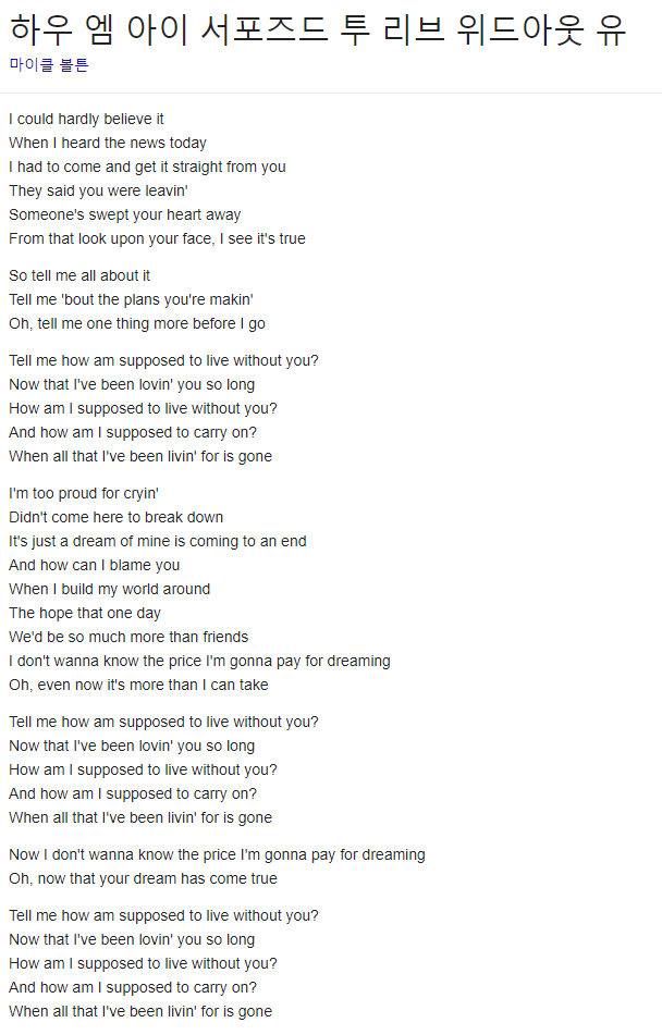 "마이클 볼튼(Michael Bolton)" 의 "하우 엠 아이 서포스 투 리브 윗아웃 유(How am I supposed to live without you)" 입니다. 한때 모든 여성들의 사랑을 한몸에 받았던 멋진 외모(지금은 좀 촌시러운듯)와 허스키 보이스를 가지 뮤지션입니다. 남자들도 노래방에서 이 노래 불러서 인기 좀 얻어 보려고 많은 노력을 했지만 소화하기 힘든 노래라 소기의 목적을 달성한 분들은 그리 많지 않았던 것 같군요. ㅎㅎㅎ 그럼 잠시 하던 일 멈추고 눈을 지긋이 감고 잠시 90년대로 돌아가 보도록 하시죠~~~