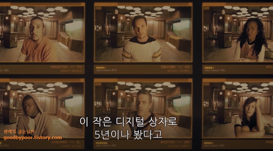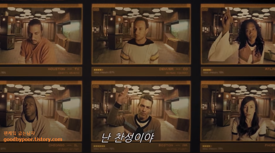 그래서 결국 이런 모습으로 살아남은 각자는 살아가게 됩니다. 요즘 밖에 못나가고 집에서 지내는 사람들의 모습이 오버랩되는군요. 역시나 가장 무서운 건 질병이 퍼지면 혼자서 고립되어 지내야 한다는 사실인 것 같습니다. 하지만 이 벙커도 인터넷망이 잘 구축되어 있습니다. 그래서 지내는 건 혼자이지만 7명이 한 그룹이 되어 서로 온라인 화면상으로 도와가며 살고 있죠. 그들은 자신이 살고 있는 도시의 이름으로 서로를 부릅니다. 올랜도, 피닉스, 덴버등등...