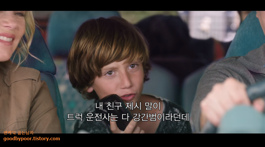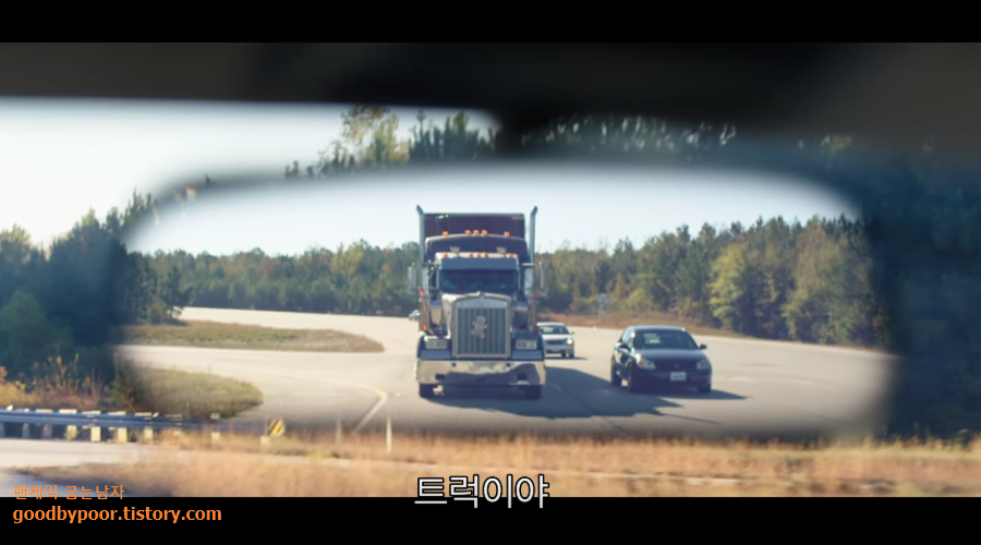 자신의 흑역사에 망연자실한 표정을 짓는 엄마. 그렇게 그들은 다시 다음 여정을 위해 열심히 고속도로를 달리게 되는데 여기서 또 하나 일이 생깁니다. 예전 무전을 날렸던 그 큰 트럭이 뒤에서 죽일 듯이 쫓아오고 있는 거죠.