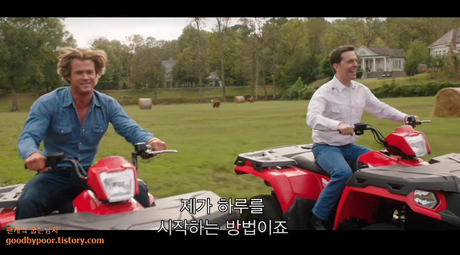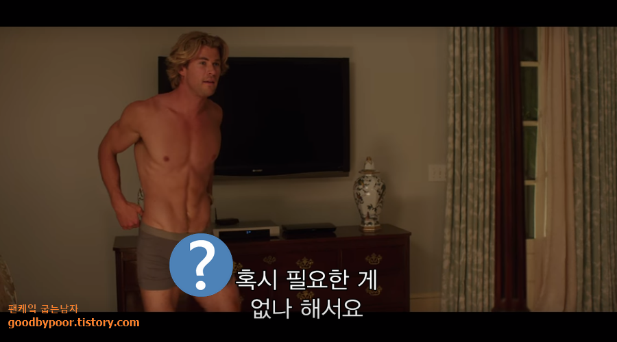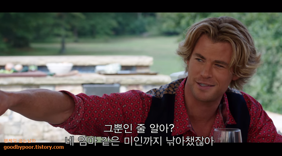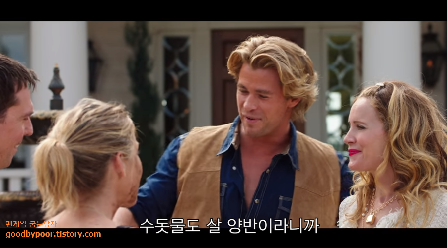 우여곡절 끝에 도착한 바로 그 고모부의 집...누구냐구요? ㅋㅋㅋ 여자분들 꽤나 소리지르게 만드는 바로 그 남자. 토르입니다. 아니 크리스 햄스워스 입니다. 아니 형이 왜 여기서 나와? 이 친구 자신의 멋진 이미지를 버리고 확실히 망가져 줍니다. 기대하셔도 좋습니다. 남자분들은 웃픈일을 당하게 될 겁니다. 웃긴데 왠지 슬프다...머 그런거요. 왜 냐구요? 보시면 압니다. 안다구요!!!