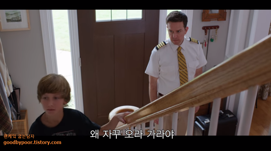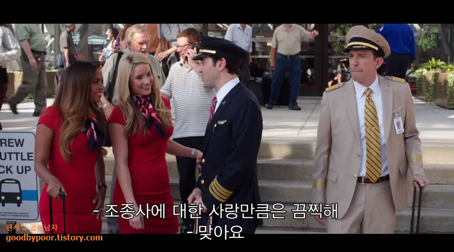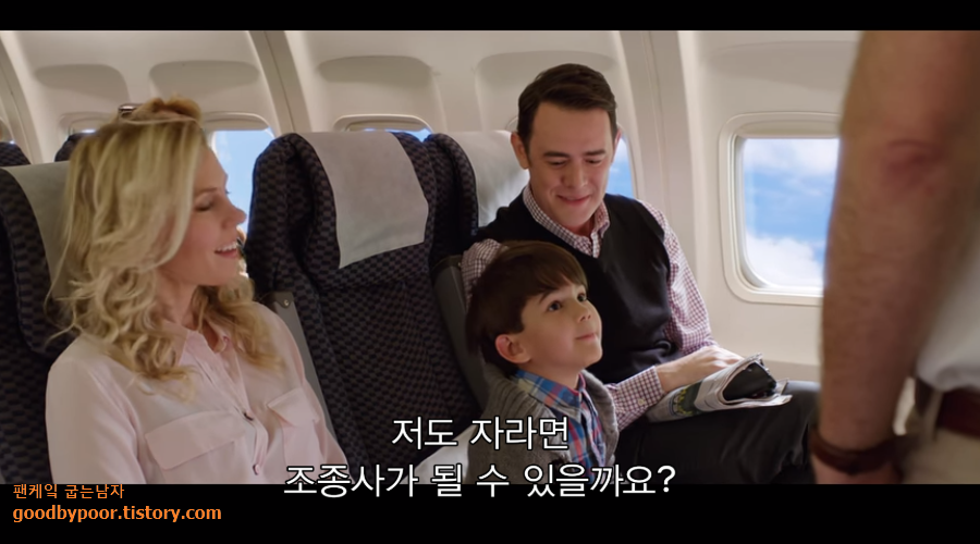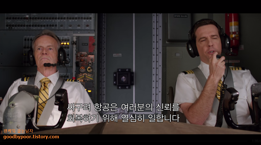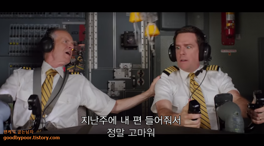 저가 항공사의 기장인 아빠...이 영화의 주인공이라 할 수 있죠. 오늘도 열심히 비행기를 몰며 가족을 위해 일하는 중입니다. 역시나 스멀스멀 풍기는 아빠의 허당끼. 잠시 쉬러 나가다가 마주친 꼬마 손님에게 친절한 설명을 해주던 중 난기류로 인한 기체 흔들림으로 꼬마의 엄마에게 그만... 아빠에게도 그만... 우선 이렇게 웃음 워밍업을 시작합니다. 옆에 탄 부기장님... 역시 치매끼가 있으신지 했던 말을 계속 반복하죠.