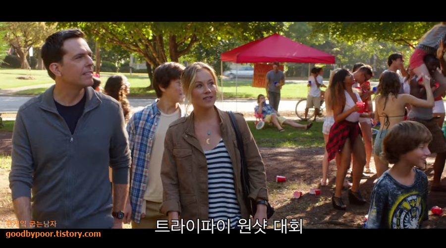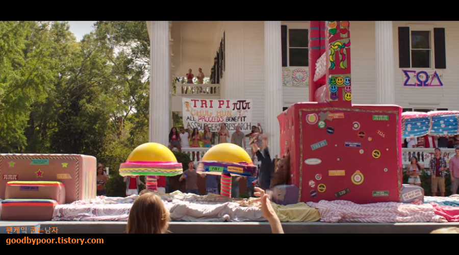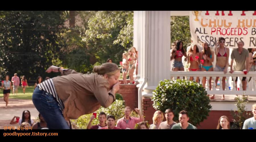 이 가족의 첫 번째 여정이라 할 수 있는 엄마가 졸업한 모교 멤피스 주립대학... 마침 축제가 열리고 있는 듯합니다. 그중 트라이파이 원샷이라는 대회를 보게 되고 이 대회가 바로 엄마가 대학 다닐 때 직접 만든 것이라는 걸 알게 되죠. 그런데 이 대회의 목적은? 사실 엄마의 과거사가 속속들이 펼쳐지게 됩니다. 바로 순진하고 착해 보이기만 지금의 모습과는 다르게 대학 때는 술고래에 날라리였다는 사실... 이 대회를 운영하던 학생들이 엄마에게 도발을 합니다. 늙으셔서 이젠 참가하기 힘드시죠?...라고