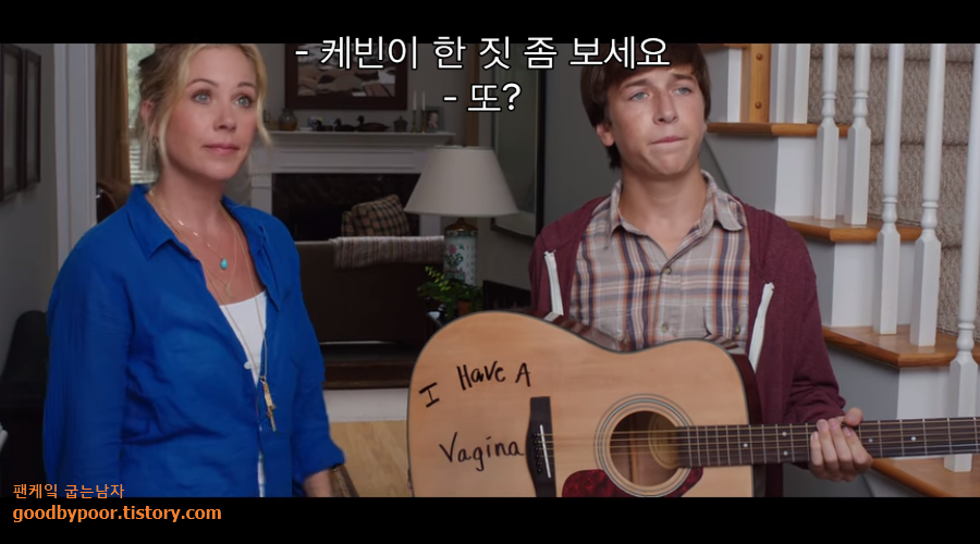 집으로 돌아온 아빠. 도착하자마자 "난 xx를 가졌어요" 라는 낙서가 쓰여있는 기타를 들고 엄마에게 하소연 하는 큰아들을 보게 됩니다. 제멋대로인 말썽쟁이 동생이 형을 놀리기 위해 낙서를 한 거죠. 저 단어 뜻이 궁금하다고요? 한번 찾아보세요. 그럼 그 의미를 아실 겁니다. 굳이 해석은 하지 않겠습니다. 이런 동생의 장난에 순진하게 당하고만 있는 형... 한마디로 동생의 밥이죠. ㅎㅎㅎ 이 형제의 케미도 이 영화의 웃음 포인트 중에 하나입니다. 엄마 역시 어딘지 모르게 맹한 듯한 미인이죠. 엄마의 스토리도 기대해 보시기 바랍니다.