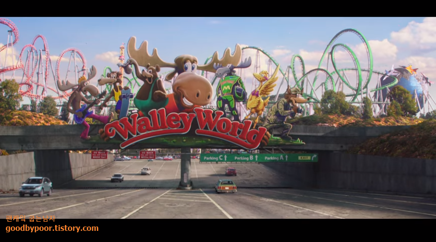 바로 놀이동산 월리월드로 가족여행을 떠나기로 마음먹은 것. 하지만 가족 누구도 원하지 않습니다. 그래도 아빠는 꿋꿋하게 최대의 놀이기구가 있다면서 가족들을 설득하죠. 거기에 알바니아에서 만들었다는 이상한 렌터카까지 가져와서 자랑합니다. 이 자동차가 꽤나 물건입니다. 여기에도 웃음코드가 꽤나 담겨있습니다. 그것도 우리나라와 관련된 것들로요. 재밌는 장면들이 많은데 직접 보실 분들을 위해 남겨두겠습니다. 단순히 글만으론 특별한 재미를 느끼기 힘드시겠지만 직접 보시면 아주 재미납니다.