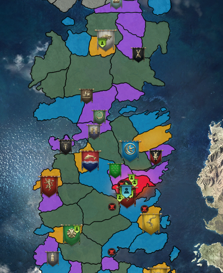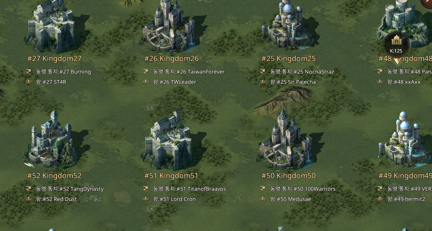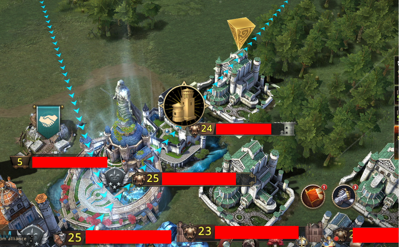 왕좌의 게임 온라인은 나름 글로벌 게임이라 할 수 있습니다. 오른쪽 성들은 각 서버들을 나타내는데 각 서버에 들어가면 왼쪽과 같은 지도가 나타납니다. 내가 속한 동맹은 하나의 서버 안에 있는 한 무리인 것이죠. 하나의 서버에는 여러 동맹이 존재하게 됩니다. 각 동맹은 친할 수도 적대적일 수도 있는데 각 동맹 중 가장 강한 동맹이 지도의 좋은 장소를 차지하게 되죠. 예를 들어 자원이 많은 곳이라던가 얻을 아이템이 많은 곳등 말이죠. 글로벌 게임답게 어떤 서버에서는 러시아 동맹이 가장 강하다거나 어떤 서버에서는 한국 동맹이 가장 강하다거나 하듯이 서버마다 특징이 다 다릅니다.