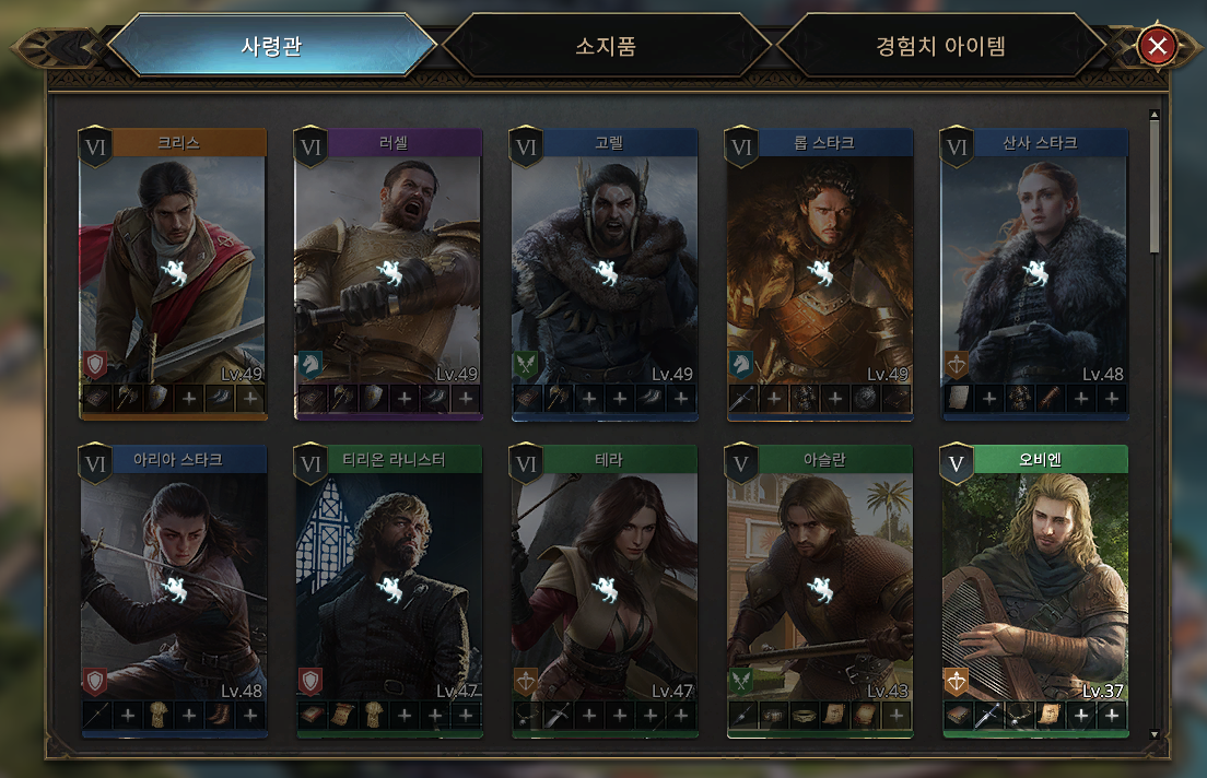 드라마의 인기를 바탕으로 만들어진 게임이니 당연히 우리가 알던 캐릭터들이 다 나옵니다. 단, 일정 레벨이 되거나 특정한 임무를 완성해야만 해금이 되어 내 사령관으로 활용할 수 있게 됩니다. 힘이 강력한 좋은 캐릭터는 어느 정도 현금을 이용해 구매를 해야 한다고 하는데 전 아직까지 크게 필요성을 못 느끼겠더군요. 강력한 힘을 가진 캐릭터의 경우 글로벌 대전에서 다른 서버와의 전쟁이나 적 동맹과 전투 시 아주 요긴하게 쓸 수 있습니다.