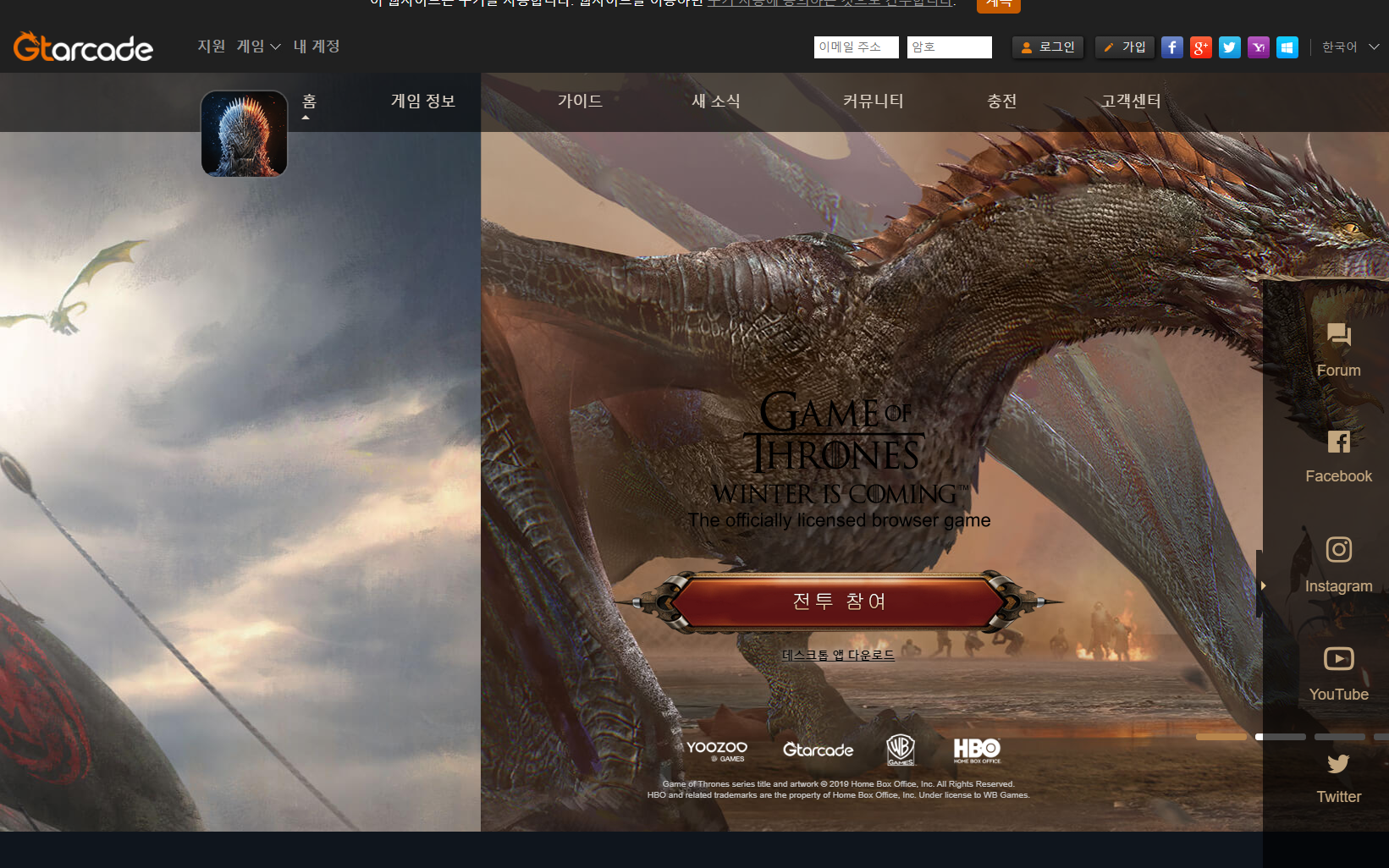 왕좌의 게임 온라인을 접속하는 방법은 개발사의 홈페이지에 가입을 하고 난 뒤 해당 홈페이지에서 바로 플레이를 할 수도 있고 이렇게 별도의 앱을 설치해 로그인할 수 있습니다. 개발사 설명에 따르면 별도로 로그인 접속하는 게 더 빠르게 게임을 진행할 수 있다고 하는군요.