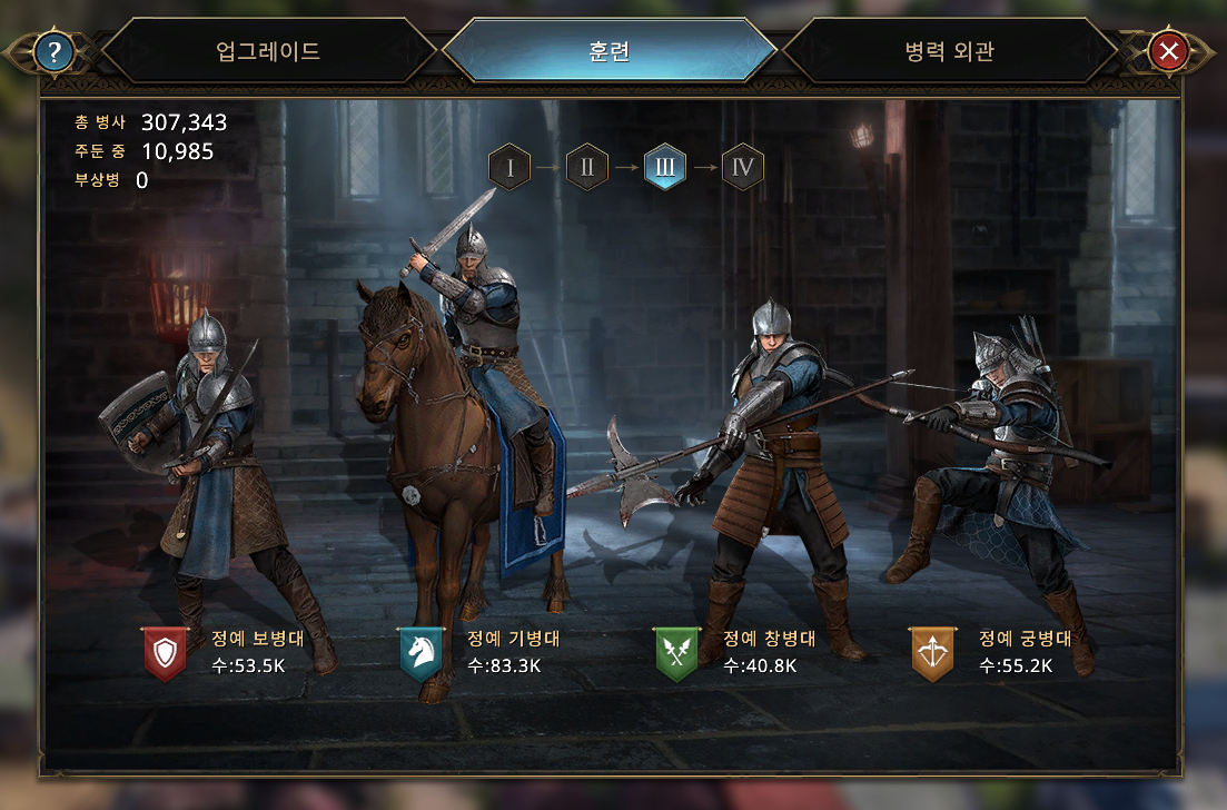 뭐니 뭐니 해도 제일 중요한 건 바로 군사력, 병력이겠죠. 왼쪽의 건물은 이러한 병력을 만들어 낼 수 있는 훈련소로 총 4단계로 업그레이드할 수 있는 보병대, 기병대, 창병대, 궁병대등으로 구성되어 있습니다. 전 지금 3단계의 병력을 꾸준히 뽑고 있는 중인데 4단계 병사를 생성하기 위해서는 아직 많은 시간이 필요할 듯합니다. 그래도 지금 30만 대군을 이끌고 있군요.