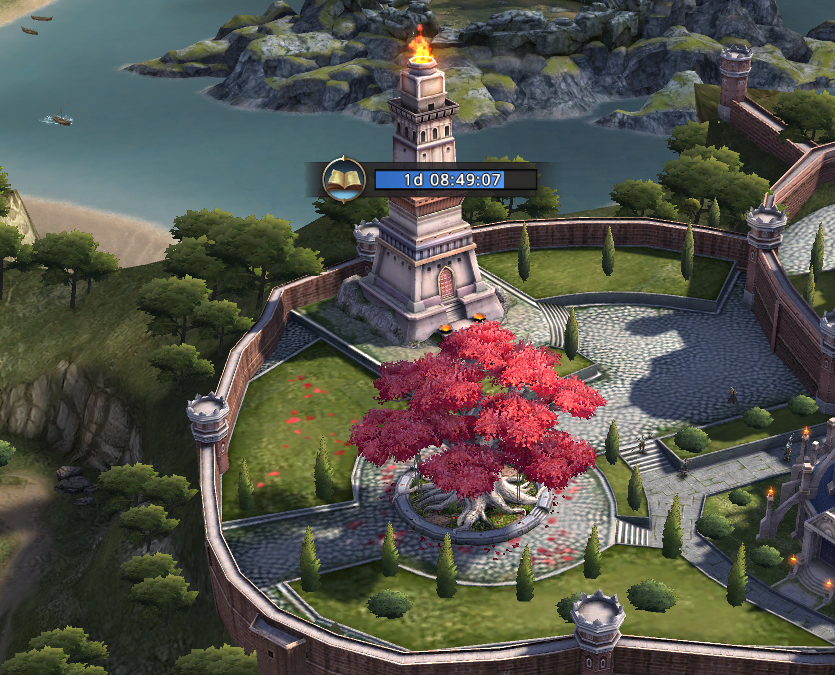 학사의 탑이라 불리는 일종의 연구소라 할 수 있는 곳인데 이곳에서 각종 스킬을 업그레이드해서 게임의 재미를 더 높일 수 있습니다. 그 아래 빨간 잎을 가진 나무를 클릭하면 또 다른 장소로 들어갈 수 있는데 이곳에서 나에게 속한 캐릭터들을 레벨이 더 높은 전사로 키울 수 있죠. 일종의 또 하나의 훈련장이라 할 수 있겠군요.