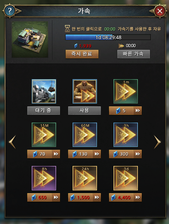 성을 비롯한 여러 건물들이나 병력 생성 등을 업그레이드할 때마다 일정의 시간이 필요한데 획득한 아이템을 활용하거나 다이아몬드를 이용해 많은 시간을 줄이실 수 있는데요. 게임하면서 얻어먹는 것들만 잘 받아먹어도 게임을 하는데 큰 무리는 없지만 오래 걸려서 답답하게 느끼시는 분들은 현금으로 구매하기도 하던데 전 개인적으로 돈까지 써가면서 하고 싶지는 않더군요. 그래도 가끔 현질을 하고 싶은 욕구가 불끈불끈... 아직까지는 잘 참고 있습니다. ^^
