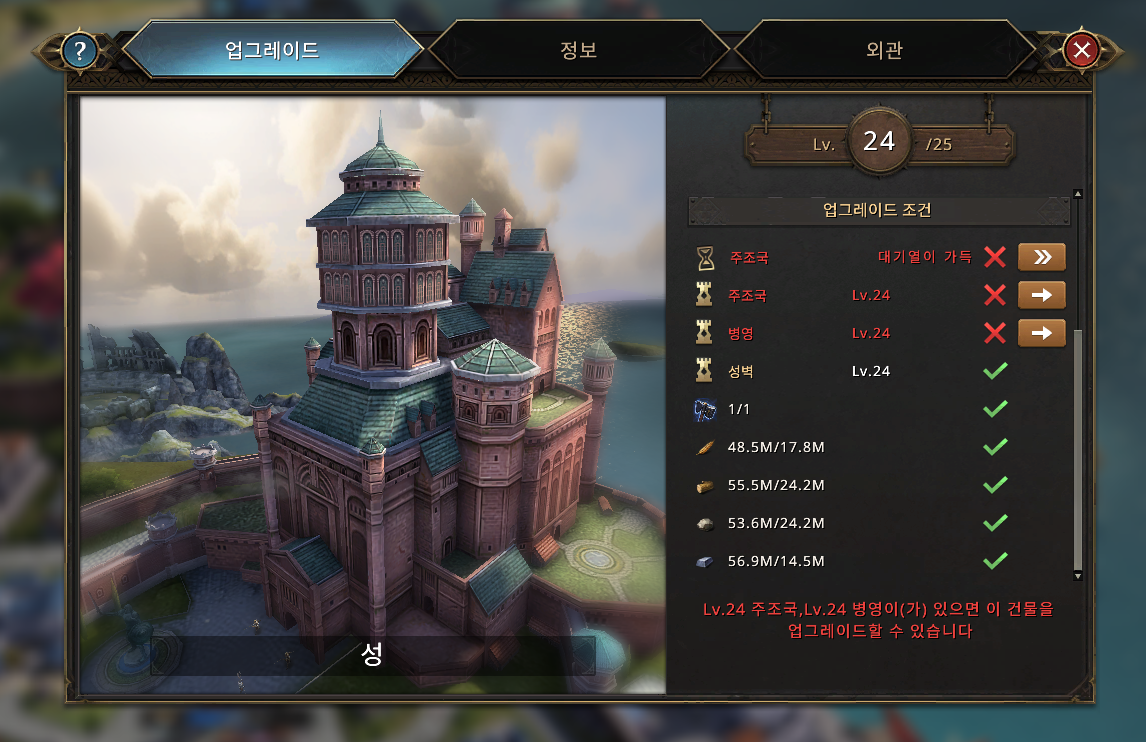 현재 전 성을 레벨 24까지 성장시킨 상태입니다. 꽤나 시간이 걸렸는데 차근차근 레벨업 하는 재미가 나름 솔솔 했던 거 같습니다. 이젠 한 번만 업그레이드하면 성은 완성이 되는군요. 레벨이 올라갈수록 병력이나 방어 등 다양한 혜택이 있으니 꾸준히 플레이하며 빨리 성장시키는 게 좋겠죠?