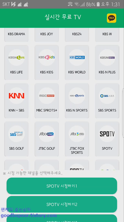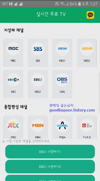 총 7개의 방송사 채널을 보실 수 있는데요. SBS를 비롯해서 KBS1 / KBS2 / MBC / EBS / EBS2 / OBS 경인 TV 를 실시간으로 시청하실 수 있군요.
