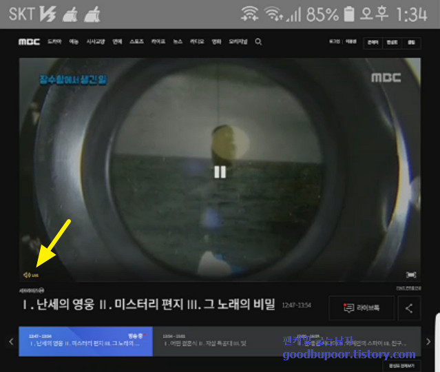 오른쪽 화면은 상단의 플레이 창을 확대한 사진인데 노란색 화살표 부분을 보시면 음량 조절 버튼이 아주 작게 있습니다. 처음 시청할 때 소리가 나오지 않길래 왜 그런지 봤더니 해당 아이콘이 묵음으로 되어 있더군요. 혹 소리가 나지 않는다면 아이콘을 눌러 소리를 켜주시면 됩니다. 화면이 작아서 모바일로는 보기가 힘들던데 화면이 좀 큰 스마트 기기는 괜찮을 듯싶습니다.