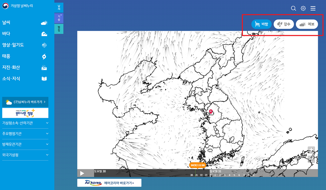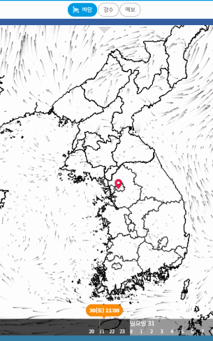 이렇게 사이트의 메인화면을 보시면 전국에 얼마의 바람이 어떤 방향으로 부는지 실시간으로 정보를 확인하실 수 있고 강수량 또한 확인이 가능합니다.