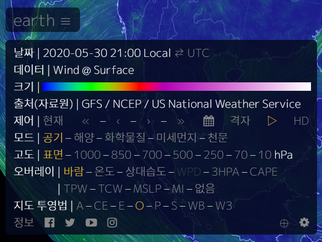 왼쪽 하단의 어스(earth) 라는 메뉴를 눌러 보시면 위와 같이 다양한 선택옵션이 나오는데요. 고도에 따라서 확인을 할수도 있고 공기나 해양, 화학물질, 미세먼지, 천문등 다양한 모드를 선택하시면 해당되는 항목으로 아래에 새로운 메뉴가 나타납니다. 예를들어 지금은 공기모드를 선택한 상태인데 아래 고도나 오버레이에 대한 내용이 나타나죠. 미세먼지를 선택하시면 오버레이 부분에 초미세먼지, 미세먼지등으로 구분되어 선택해서 보실 수 있는 다른 메뉴가 나타나게 됩니다. 해양을 선택하니 파도와 관련된 항목이 나타나는군요. 정확히 태풍과 관련된 실시간 이동, 경로 항목은 없지만 공기의 흐름을 토대로 살펴보실 수 있을 듯 싶습니다.