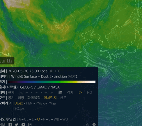 좀 독특한 형태의 사이트로 들어가시면 위와 같은 지구본 모양이 모니터에 나타나게 되는데요. 마우스를 스크롤 하시면 당기기, 밀기등으로 확대, 축소를 해서 지구 전체의 공기의 방향과 흐름, 미세먼지 흐름, 해양등 다양한 자료를 실시간으로 보실 수 있습니다. 단순히 날씨의 상태를 확인하는 것 이상으로 왠지 보고 있으면 묘한 기분까지 들어서 아이들 교육용으로도 활용하시면 좋을 듯 합니다.