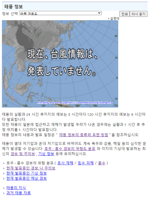 자료의 종류나 세분화는 많이 되어 있는 듯 보이지만 실제로 사용하기는 불편한 면이 다소 있는듯 합니다. 아무래도 일본에 맞춰서 만들어진 기상청 사이트다 보니 당연하겠지만 정확히 태풍이 발생했을때 실시간으로 얼마나 많은 정보가 나오는지는 더 확인해 봐야 겠군요.