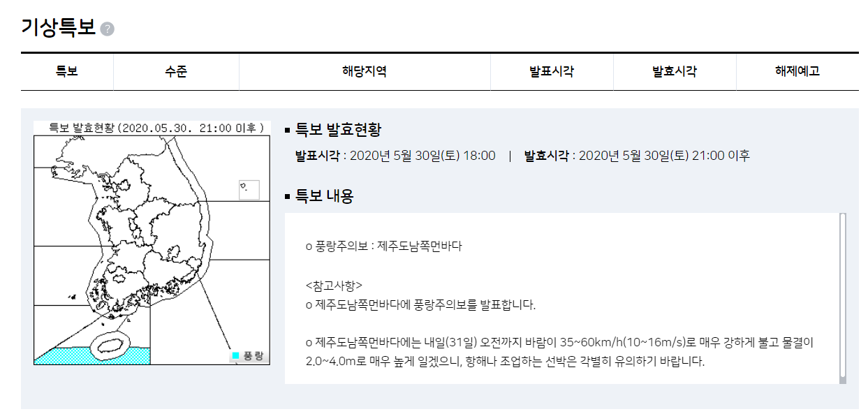 또한 전국별 기상정보를 비롯해 해상과 관련된 특보나 실시간 정보 등도 다양하게 알려주고 있습니다. 전국으로 체크해서 확인하실 수도 있고 각 지역별로 체크해서 확인해 볼 수 있는데 태풍이 몰아치는 시기가 되면 저 잠잠하던 해상이 실시간으로 엄청난 변화가 있을걸 생각하니 벌써부터 걱정이 되는군요. 그때 가장 필요한 정보가 바로 실시간 태풍의 이동 경로나 예상 경로 등이 아닐까 싶군요. 아직은 태풍이 시작되는 시즌이 아니라 검색해 보니 이렇게 나옵니다.