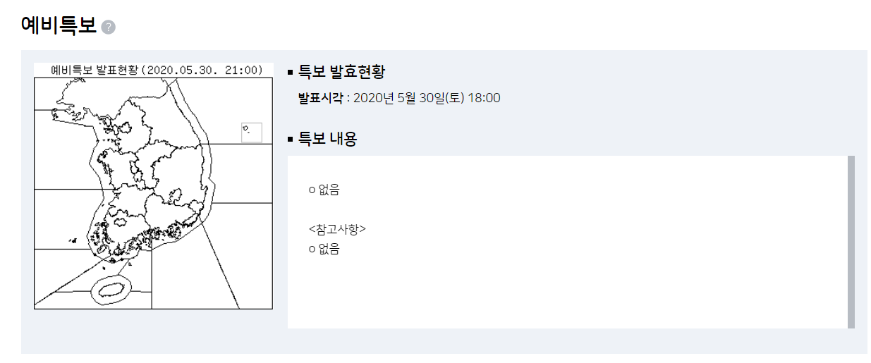 또한 기상특보, 예비특보 등 미리미리 변동되는 날씨에 대응할 수 있도록 관련된 내용을 알려주고 있습니다. 실시간 현황도 중요하겠지만 무엇보다 미리 예비할 수 있는 이러한 정보들이 더 중요할 것 같군요.