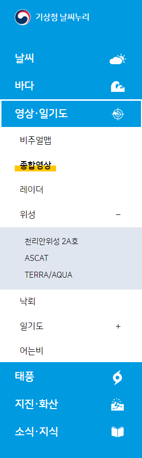 메인화면과 다양한 메뉴들을 통해 필요한 날씨정보 태풍정보 등을 실시간으로 이동경로 등을 보실 수 있고 지진이나 화산과 관련된 정보도 확인하실 수 있습니다. 레이더와 위성을 통한 정보도 확인할 수 있네요. 현재 기상 관련 위성이 3~4대가 있는 것 같군요. 이참에 우리나라 기상 위성에 대한 정보도 알아두시면 좋겠군요. 천리안 위성 2A호 / ASCAT / TERRA / AQUA 등이 열심히 기상 위성사진을 전송하고 있는 중입니다.