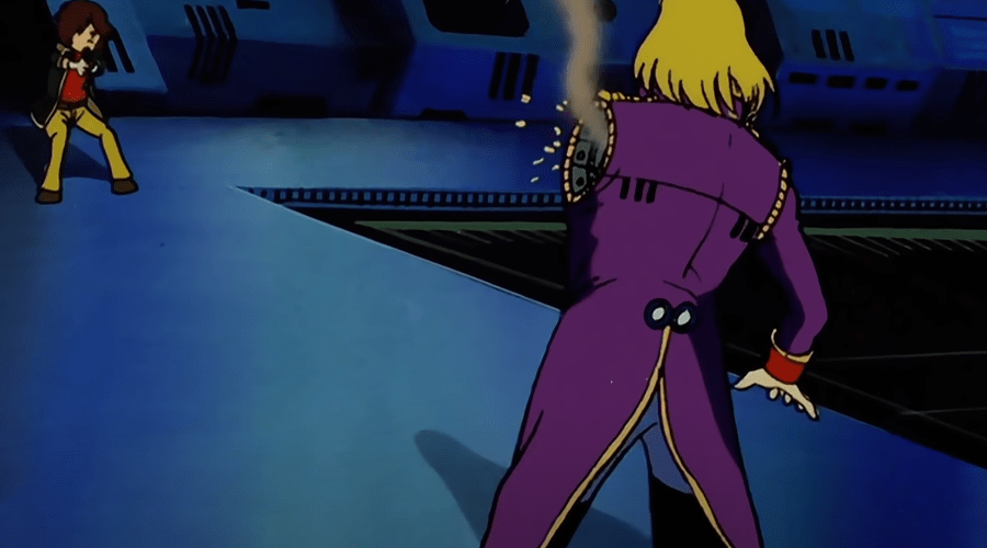 어렵게 행성에 도착한 철이는 놀라운 장면을 목격하게 됩니다. 그 행성의 여왕 즉위식을 보게 되는데 즉위식에 오르는 인물이 바로 그동안 그리워했던 메텔이었다는 겁니다(여기서 추측컨데 철이를 떠났던 건 아직 해결해야 할 문제가 남아있고 이일을 혼자 해결하려 해서가 아닌가 싶더군요.). 이 광경을 보고 철이는 메텔을 암살하려고 마음먹습니다. 하지만 결정적인 순간에 마음속에 남아있던 메텔에 대한 감정으로 인해 암살은 실패하고 말죠.